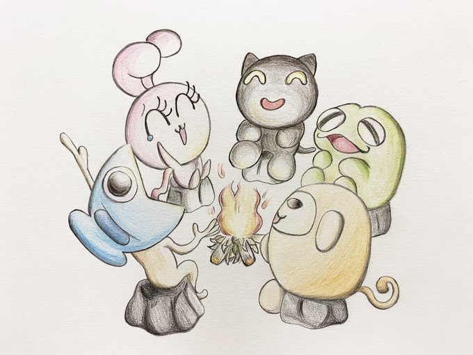焚き火を囲んでわいわい #クロネコくんとサカナさん #絵描きさんとつながりたい