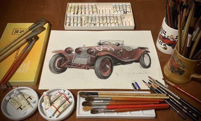 木版画No.1と同じ図柄で1929年ミッレミリアでジュゼッペ・カンパーリとジュリオ・ランポーニがアルファ ロメオで優勝という名場面をサイズ違いで制作したかったのでしょう。