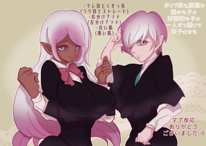 #リプ来た要素を詰めた子と対照的な子と一人ずつ描いて双子にする できましたぜ!!とある種族のハーフの姉弟の双子ちゃんになります~(^ω^)うふふ