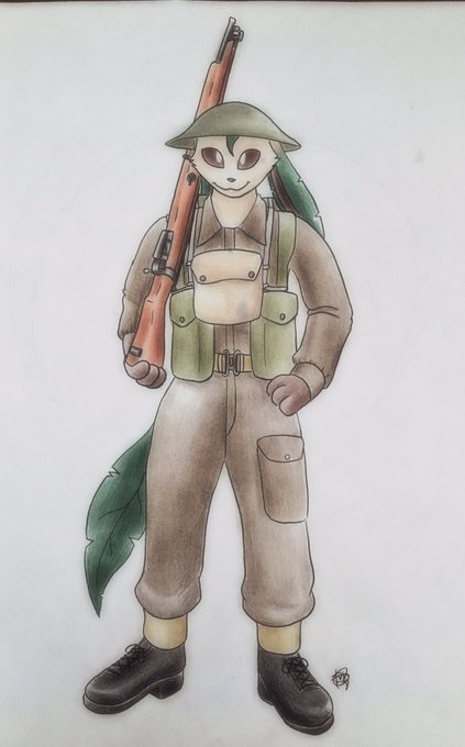 A drawing of a leafeon dressed as a WWI British infantry with a Lee-Enfield commissioned by @GlaceonSoldier - thanks for commissioning me!