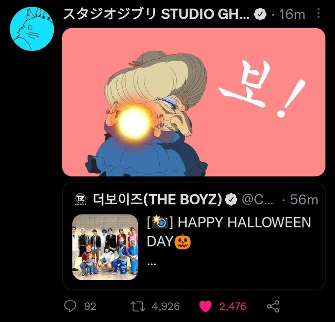 The official Studio Ghibli acc qrt-ing an official The Boyz tweet after seeing that #HYUNJAE is playing the famous role of haku from spirited away.