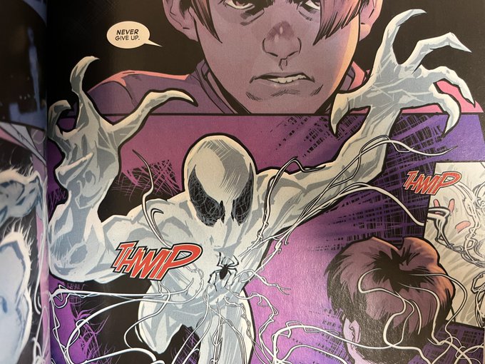このスパイダーセンスの描き方がめちゃくちゃおしゃれでビジュアルが最高。ピーターから抜け出ていくと同時にスパイダーマンがピーター・パーカーに変わる様子とか、スパイダーマンの力そのものでありながら今や彼を苦しめる痛みと化したセンスがスパイダーマンの化け物として描かれたりすごく綺麗。