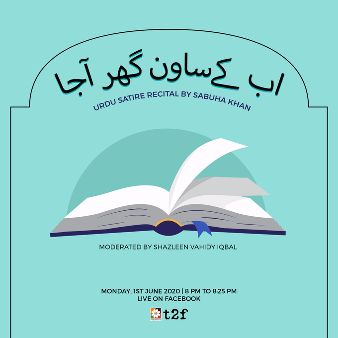 Join us for a session with Sabuha Khan, renowned writer and chairperson Readers’ Club, in conversation with Shazleen Vahid Iqbal, featuring Urdu satire recital by Sabuha Khan on Monday, 1st June 2020 at 8:00 PM, on T2F Facebook Live!