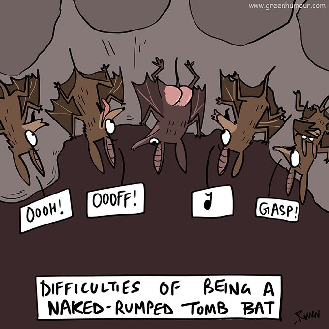 Difficulties of being a Naked-rumped Tomb Bat (yes, there's actually a bat species by that name, and yes, it's rump is really naked, and yes, it is found in India!). Cartoon from my @RGSustain1 column.