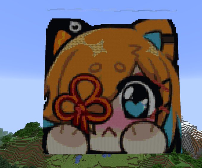 Newest Minecraft art is complete! This one is of Shiki Miyoshino's adorable blush emote. It took about 12 hours total and right around 10000 blocks. As soon as I saw it in her chat I knew I had to make it, it's too cute not to!