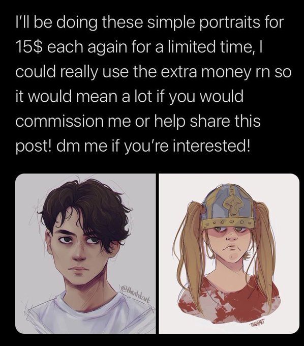 Emergency commissions, opening another 5 spots. 15$ for the portraits (5$ extra for an extra person) and 10$ for a cute head/icon! dm me!