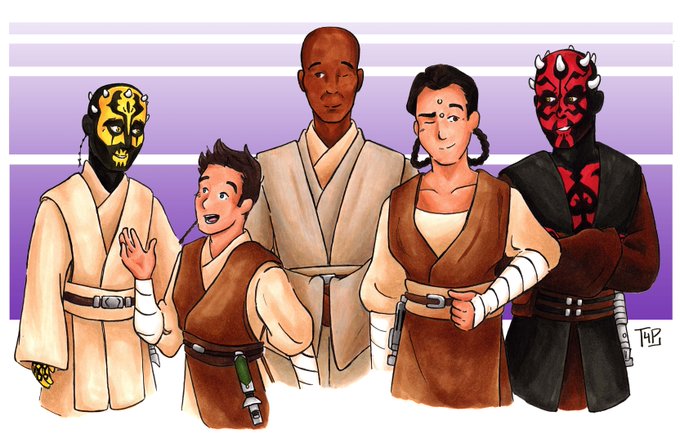 The Windu Line, in an AU where Maul becomes a Jedi as Mace's apprentice after Depa and then takes Savage as his own padawan. Commission for @pangolinart who has the most giant brain. 💜💜