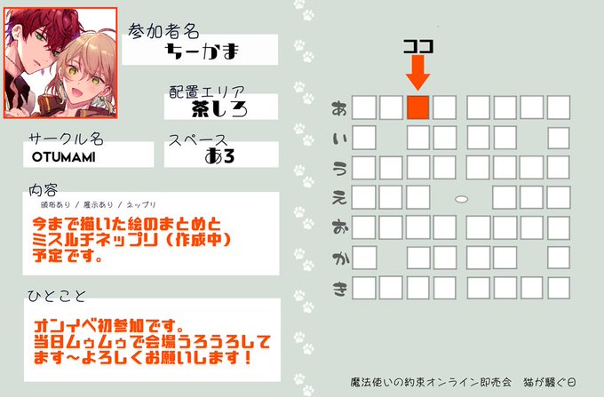 #猫騒ぎ1122 明日の猫騒ぎ茶しろ:あ3「OTUMAMI」 で参加してます~ミスルチネップリ絵は今描いてるので開催時間中に間に合ったらいいな~と…よろしくお願いします!