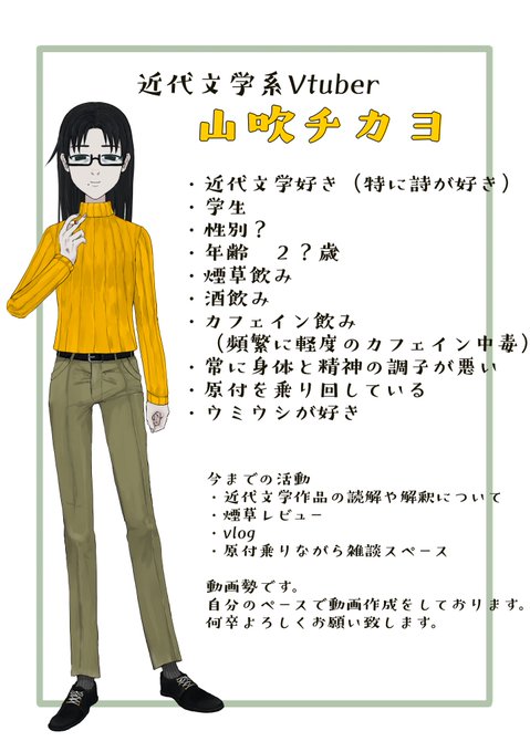 初めましての皆様、近代文学系Vtuberという皮を被った煙草酒カフェイン慢性的な体調不良Vtuberですが、気軽にフォローしてください。