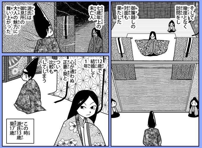 蓬生では主役になる女性の近況、家族関係が文章でずっと語られる。文字ベースで挿し絵みたいな漫画は避けたいので試行錯誤中。源氏物語は会話が延々続く場面もあるので、漫画として成立させるために苦労している。