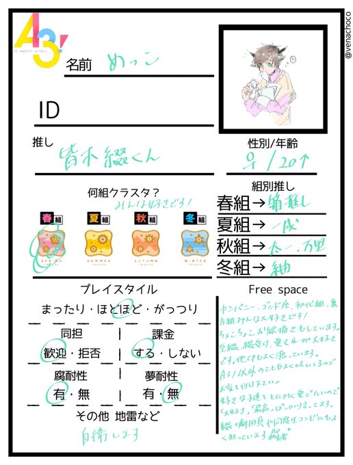 皆木綴くん最推しの春組箱推しです🌸 同窓生、綴くん受け、愛されが好きです(至綴、千綴多め) のんびり絵を描いています RT♡で気になった方お迎えにいきます!よろしくお願いします🙇♀️ #A3絵描きさんと繋がりたい