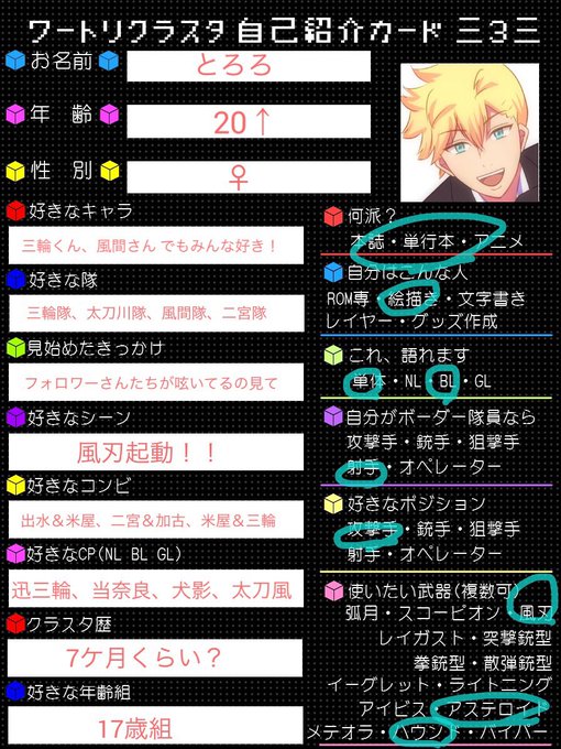 @tos テンプレお借りしました 三輪受(迅三輪、米三輪、出三輪)、出水攻(出米、出唯、出太刀)などが好きで地雷なし CP大丈夫そうな方お迎えに上がります! #ワートリクラスタさんと繋がりたい #ワートリクラスタ自己紹介カード