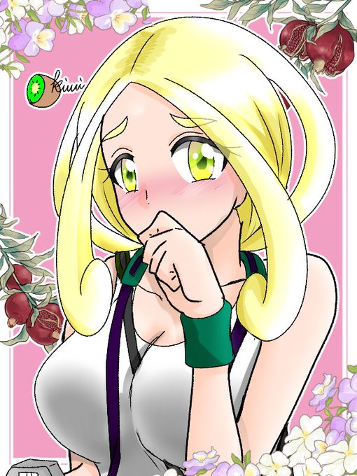 イラスト調、女性、癖毛の金髪、毛先がカール、蝶のバレッタで髪の毛をまとめている、金色の毛の太眉、タレ目、緑色の目、二重、まつ毛は一本、白のタンクトップ、緑のカーゴパンツ、巨乳、へそを出している、おしりが大きい、グリーンのリボンがついたブーツ、カメラ、左手に緑のリストバンド