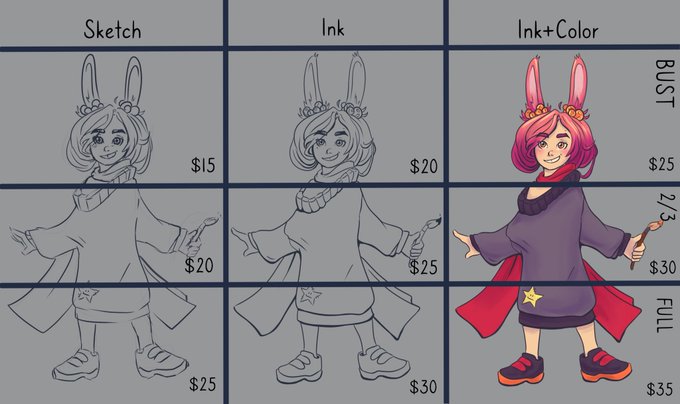 @sieminglyy My rogue bodyguard Rose, unnamed fox inspired character, Nyx my asshole ice sorceress, and unnamed bunny child goddess/spirit. (Sorry, some are pricing guides for commissions 😅)