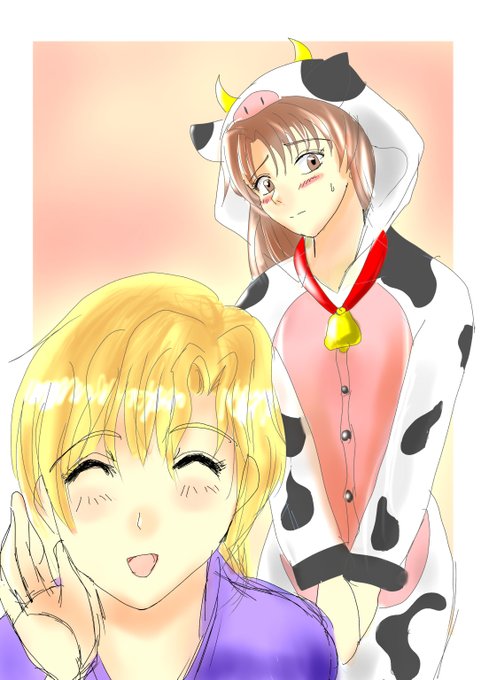下手くそですが、私がイメージするメルエーナ(牛コスチューム)と、彼女を見た感想をジェノに尋ねるバルネアさんというイメージで。