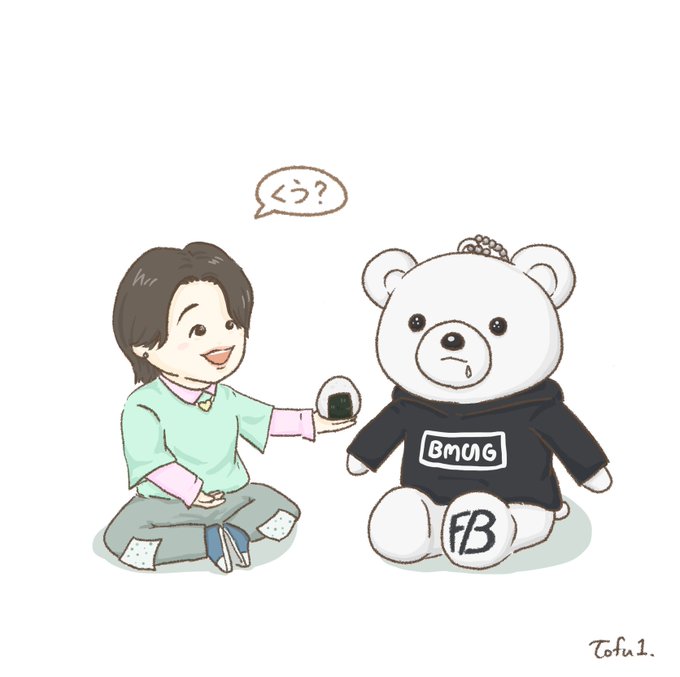 お腹が減ってるから口がへの字なのかもしれないクマちゃんにおにぎりを分けてあげる🍙