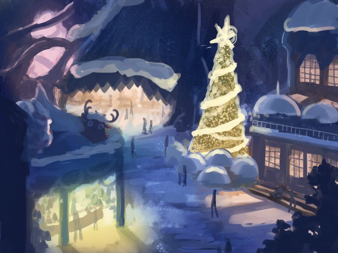 歩行者のシルエットを整えて、雪を降らして完成! 奥の建物はガウスぼかし入れてみた。 筆のタッチでぼやかし効果入れられたらいいんだけど、 なかなか難しいね(==; #CLIPSTUDIOPAINT