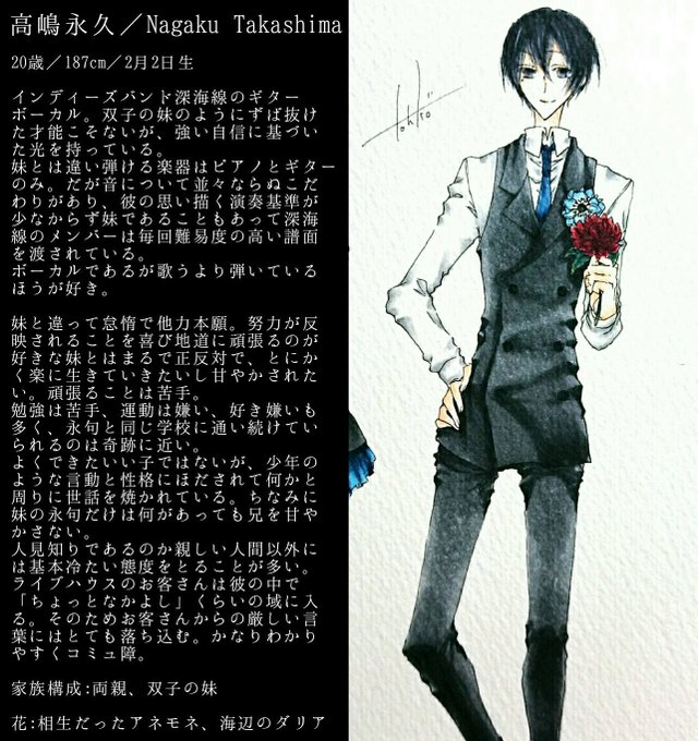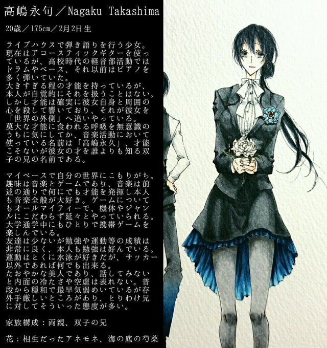 高嶋永久・永句 /たかしまながく・ながく #いい双子の日 インディーズバンドのギターボーカルをする兄、弾き語りをする妹。音楽に触れる年数や始まりは同じだが、才能には絶望的なほどの開きがある。妹は自覚などなく、兄は受け入れて自身の名前を妹に貸している。仲のよさはそこそこ。