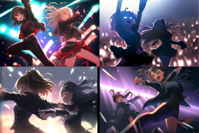 アイドルに踊らせる指示は顔まわりが安定しないですねぇ。 人数を2人に減らしても同じなのでプロンプトかサンプル数の問題かなぁ。。。 #nijijourney #Aiart