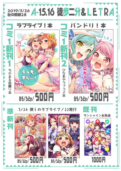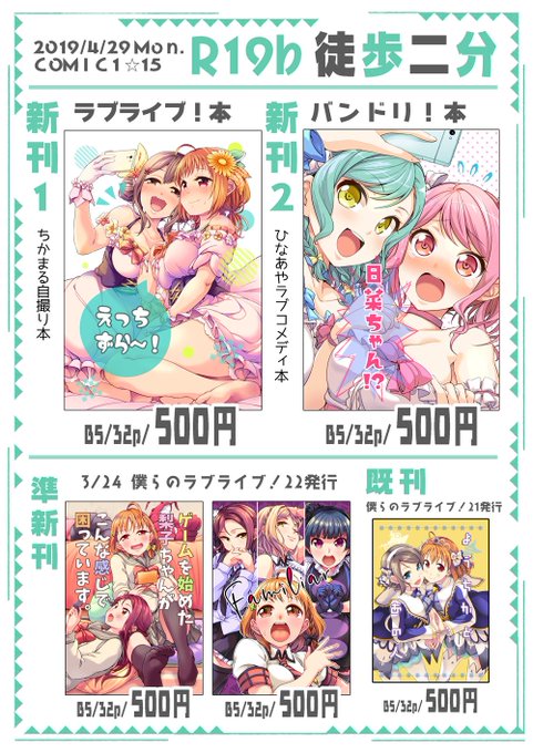 4/29のイベント、Comic1☆15のお品書きです、R-19b『徒歩二分』で参加しています。新刊はちかまる本(詳細→https://t.co/KHCJPVhIaW)とひなあや本(詳細→https://t.co/zaUOVK5sLH)です、あと既刊も持っていきますのでよろしくねー
