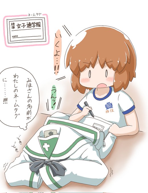制服ちゃんに名前を書こうとするみぽりの絵