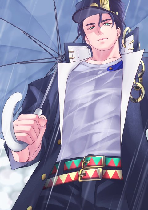 急に雨が降ってきたので屋根があるところでしゃがんで雨宿りしてたら「傘、入るか?」って声かけてきてくれた時の承太郎 #ジョジョ #空条承太郎