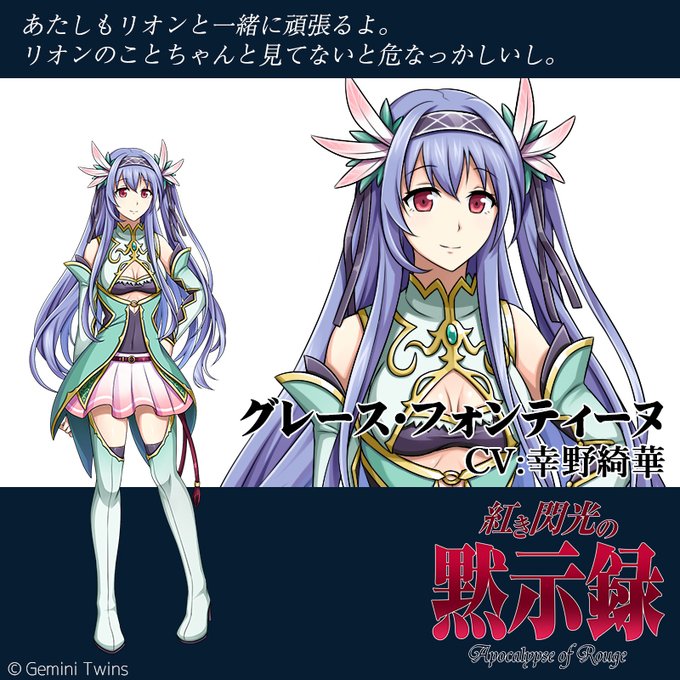 【既存情報おさらい】 紅き閃光の黙示録のヒロイン二人目のグレース・フォンティーヌは幸野綺華さんが演じられましたのです。リオンの幼馴染でリオンのことを常に気にかける優しい女の子で衣装が可愛いですね!ヒーラーとして活躍してくれそうなのであります、はい! #紅き閃光の黙示録 #幸野綺華