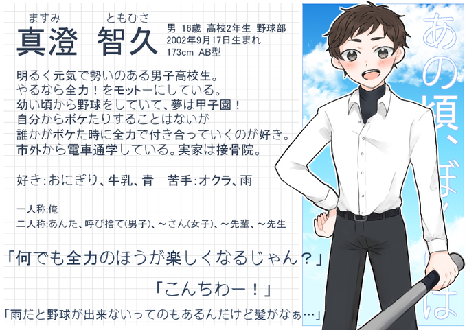 こちらの企画様(@anbk_19)に参加させていただきます。 やるなら全力!の明るく元気で勢いのある男子高校生です! 様々なご縁に巡り合えることを楽しみにしています。よろしくお願いします! #あの僕_CS_生徒 #あの僕_野球部