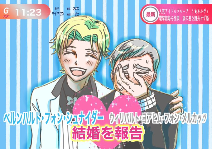 人気アイドルグループ、ミ⭐︎ネルヴァのシュナ君とメル様が遂にゴールインしたんだってー((*´∀`*))いつするかファンはドギマギしてたから、やっとかーってなったらしいよー😂お幸せに✨