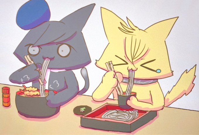 遅くなりましたが今日は蕎麦の日らしいので、お蕎麦を食べてるニャン提督達を描きました🍽ニャンはあったか海老天蕎麦で、ハルト様はもりそばを食べてますね☺️でも、わさび入れ過ぎてツーンとするのかハルト様は涙目ですね😂自分はあったかい蕎麦派なので、軽く七味入れてるぐらいです😌入れ過ぎ注意🫙