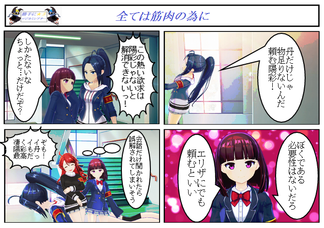 1コマ目は壁ドンに見せかけた片手腕立て伏せしてるアオニキ。2コマ目は壁ドンされてる風に偽装した陽彩ちゃん。3コマ目は筋トレの負荷をかける為のお誘い。4コマ目は丹と陽彩乗せて腕立て。というイメージで勘違いモノを作りたかったけど、なんか違う😇