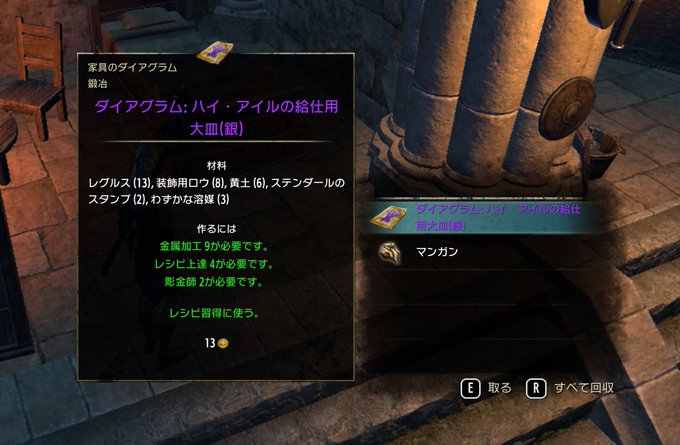 今日のeso。(1)ToTのpveデイリーでさらにランクが上がってなんかアップグレートが出たぞ…ってこれ赤鷲のじゃないか…なんでまだ持ってないデッキのが出るんだ設計はどうなってるんだよ設計は(2)スタネクロアルトマーをマークマイアにやったらいきなりこの家具レシピが #ESO_JP