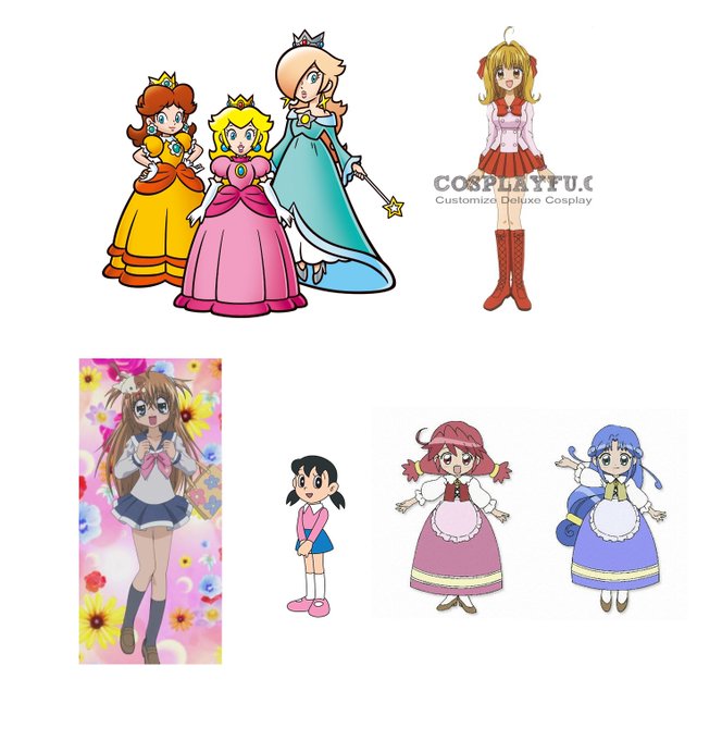 アイカツのスターライト学園制服の衣装を着た、ファイン、レイン、源静香、月島きらり、七海るちあ、ピーチ、デイジー、ロゼッタを、全身画でお願いします。(画像は霧矢あおい)