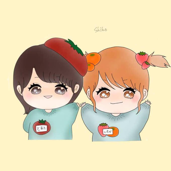#新しいプロフィール画像 いやまさか描いてもらえると思わんくてふざけて送ったコテキャ右のなんよ トマトの帽子被せてくれてるのも髪色もふんわりした色味も目の色もトマト食べようとしてるのもおくちもトマト持ってるおてても全部かわいすぎる 名前までかわいいの何事こんなんアイドルのサインやん