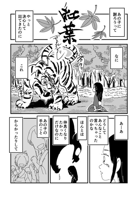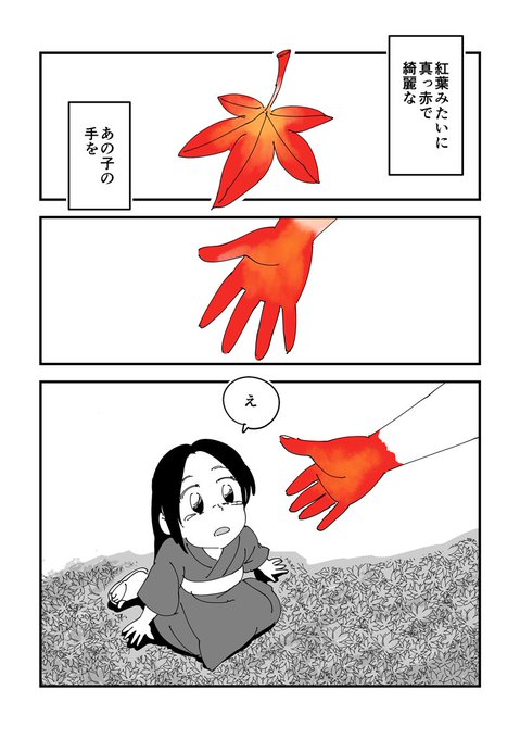 【お題漫画・紅葉】村外れに住む少女「ざくろ」と長老の娘「あけび」の物語。村人を物の怪から守りながらも、生まれ持った赤い痣のせいで疎まれるざくろ。そんなざくろの赤い手を、紅葉みたいで綺麗だと思うあけび。二人は赤い手によって離され、そして近づくのでした…。