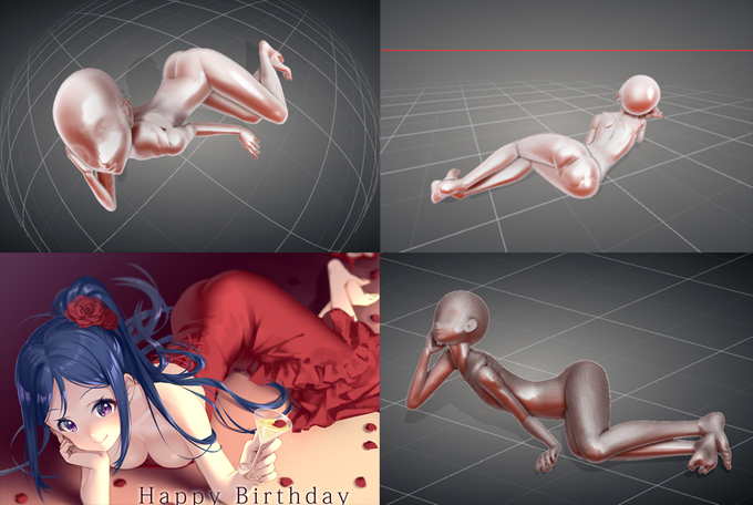@tomimin 昨日描いた果南誕絵は、DesignDollを使いました。まず自分でとらせたいポーズで描いてから3Dでウラをとる流れをお勧めします。DesignDollまだいろいろ硬いし柔らかすぎる。あくまでパーツの位置関係とそのつながりを参考にする程度に。