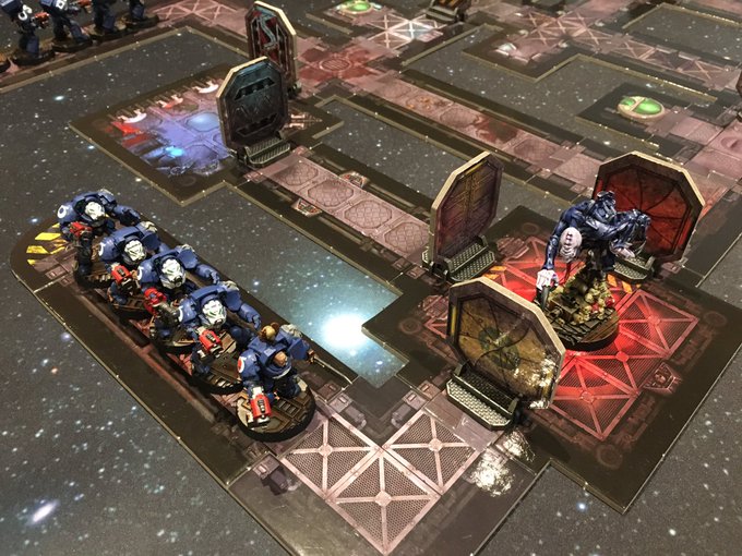 Pleasure of hosting Veteran Brother-Sgts @FWorthingham & @sprandell for #Ultramarines #SpaceHulk Mission 2 last evening. Tense, brutal combat saw the Space Marines annihilated in 11 turns, though the Broodlord was dispatched. Super game, gents! Warmongers #WarhammerCommunity