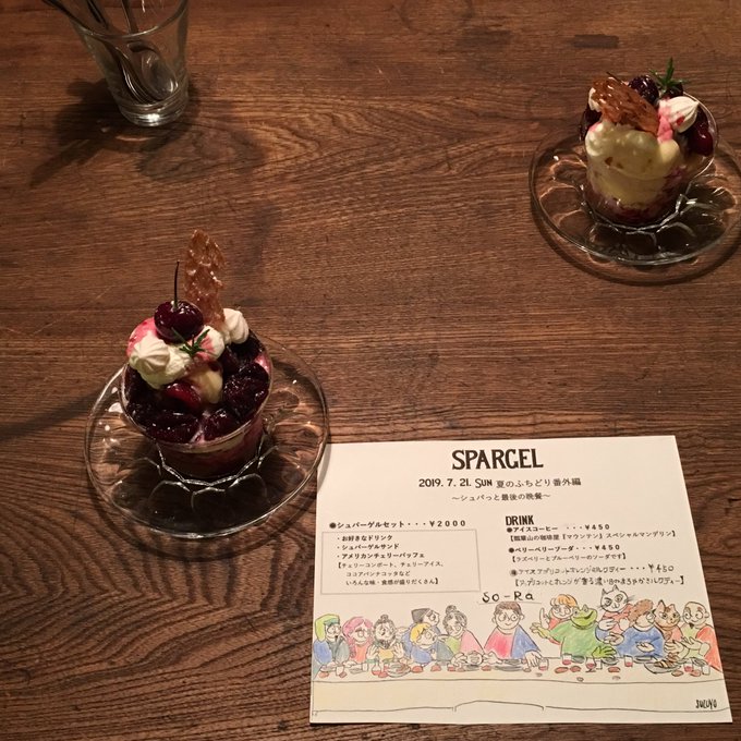 盛り込み過ぎて完成出来るか焦りもありながら、星のパーツ貼りもご協力頂いて皆さんに見守られながら、思った以上の仕上がりになりました。制作終わりのシュパさん (@spassatengel )の最後の晩餐、マジ滲みました〜🍒🐸ミニパフェの食感の楽しさったら😉(またまた画像拝借🙇)