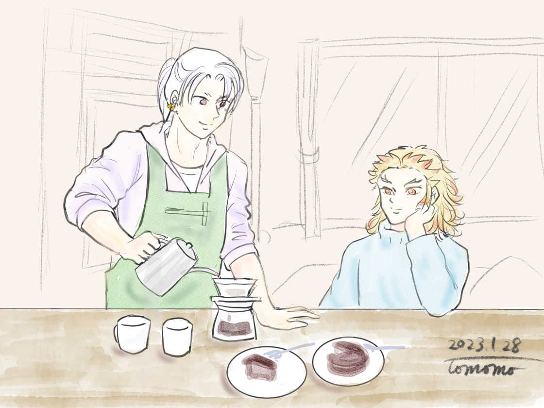 今月描いた画。普段はインスタントだけど、🔥さんいる時だけ豆挽いて丁寧に☕淹れる💎さんならタヒれる💖