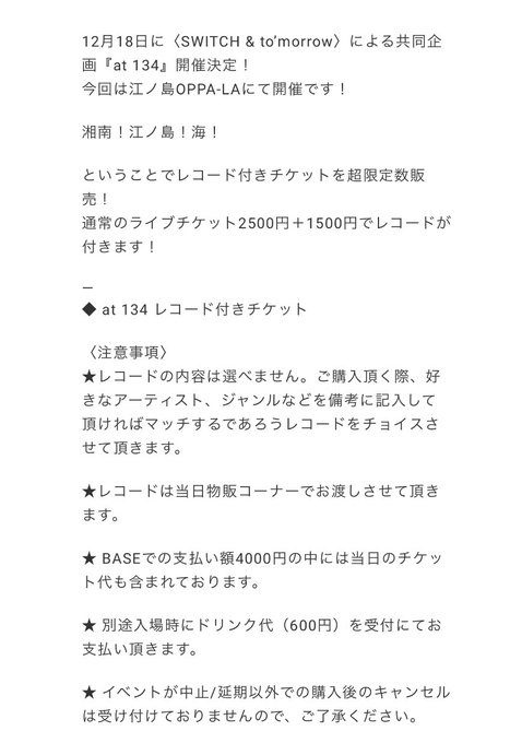 🇯🇵 at 134 / レコード付きのチケット ¥4000 🇯🇵