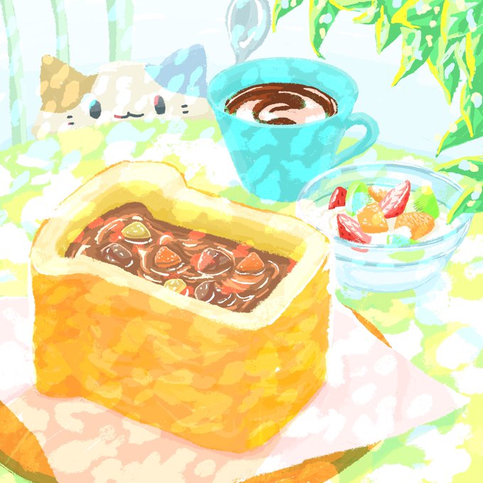 パンのシチューの朝ごはん。 #イラスト #食べ物イラスト #foodillustration #猫 #AdobeFresco