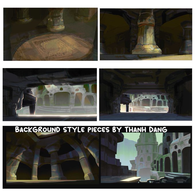 Background images I painted for the Dusk's Flight short. My friend Thanh Dang did a few pieces of background styles, which I sampled by hand (Have to clarify this isn't AI bullshit) when I painted the rest of the backgrounds. I learned a lot of new digital painting techniques