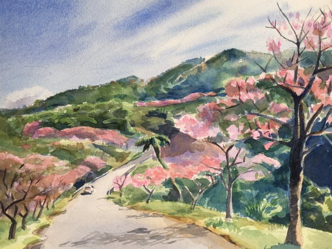 今日描いた絵です。八重岳の桜