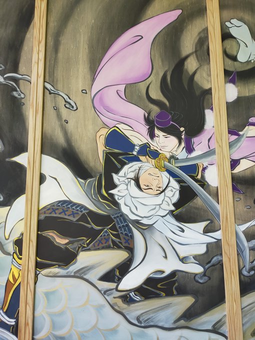 自慢の太刀を交える義経と謙信。 この位置に波の飛沫を持ってくる構図はお見事!