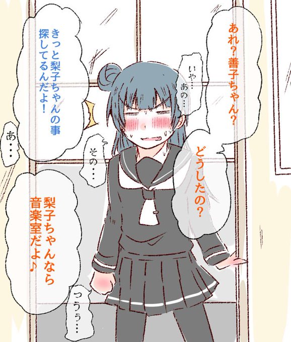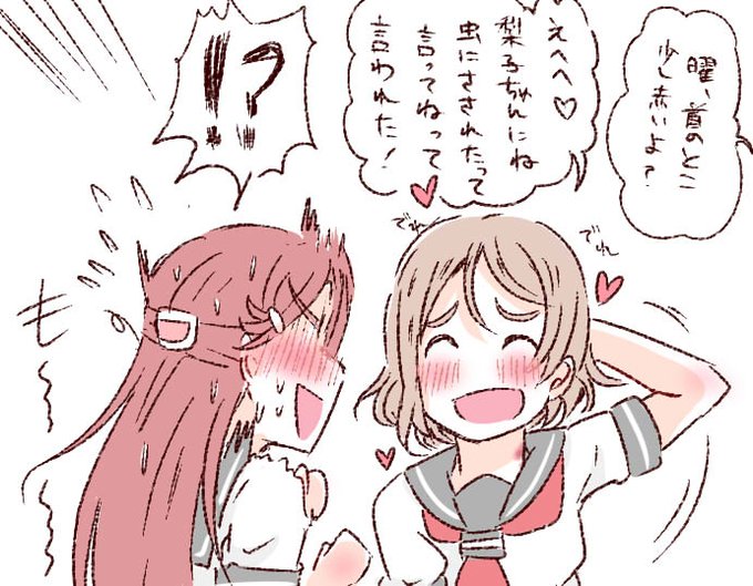 ⚓『(梨子ちゃんのばかばかばか...!あれほど見えるとこにはつけないでって言ったのに....!)』 って気にしていないフリしていたものの実は前日の事を思い出しながらすごく恥ずかしくて照れくさかったら可愛いなって思った。