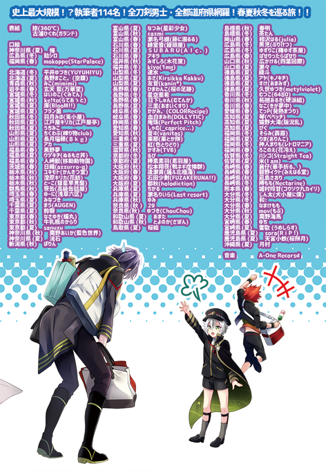刀剣男士たちが2016年現代日本47都道府県日本津々浦々を旅をして回るストーリーを集めたアンソロジー企画。今年のテーマは「四季」季節を感じるお話・イラストがたっぷりと!2016年夏コミ発行!