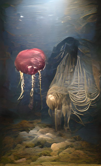 「Big jellyfish and normal size human swimming under the deep sea.」でAIに描かせるモーニン(朝の挨拶)(´ω`)ノシ