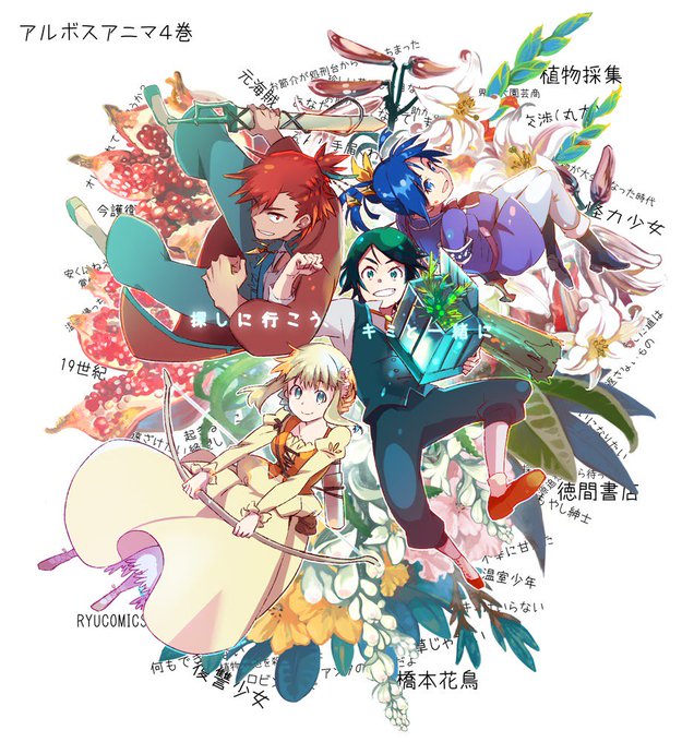 19世紀植物採集漫画 #アルボスアニマ 最新4巻は只今発売中です!カウントダウン用に描いていたイラストはこんな感じでしたー!集合絵はうっすら対角線が補色になるように塗ってましたよ! https://t.co/E91JfXj5iD