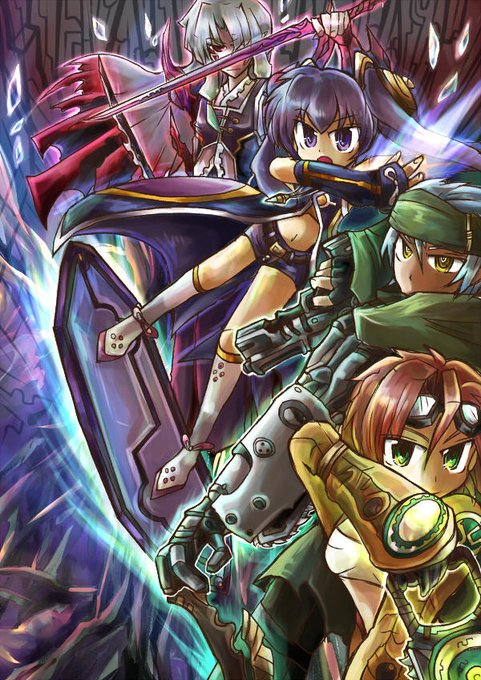 ちなみに、けっこう前に描いた、現TRPGのメンバー集合絵。おっきい剣持ってるのが私のPC、狂戦士のミコトで。高笑いしてるのが相方の厨二病、サムです。