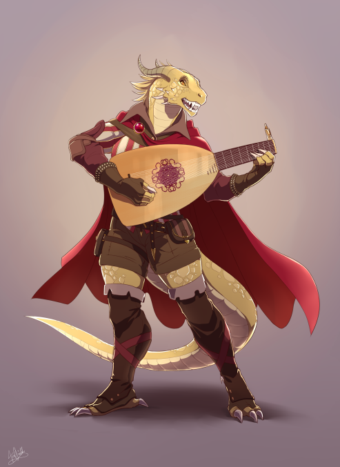 Commission of my Dragonborn Bard Nia by my friend @fiaoradd ! Thank you so much for your immense skill and willingness to draw a lute!